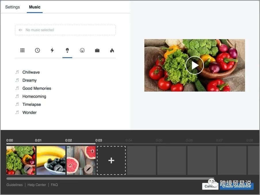(8)点击顶部的音乐,为幻灯片上传音乐(支持的格式包括:WAV、MP3、M4A、FLAC 和 OGG)。您必须拥有使用相应歌曲的所有必要法定权利。通常这意味着您获得了在幻灯片中使用这首歌曲的许可,或者拥有这首歌曲的使用权。