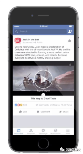 5、覆盖悠闲观看视频的用户:Facebook 视频插播广告可更长时间地吸引用户关注,在所有的视频插播广告展示次数中,用户完整观看广告的比例占 70%,且大多数为有声播放。广告可长达 15 秒,虽然更简短的广告可能效果更好。由于视频插播广告不可跳过,因此非常有利于分享更复杂的漏斗顶层营销信息。