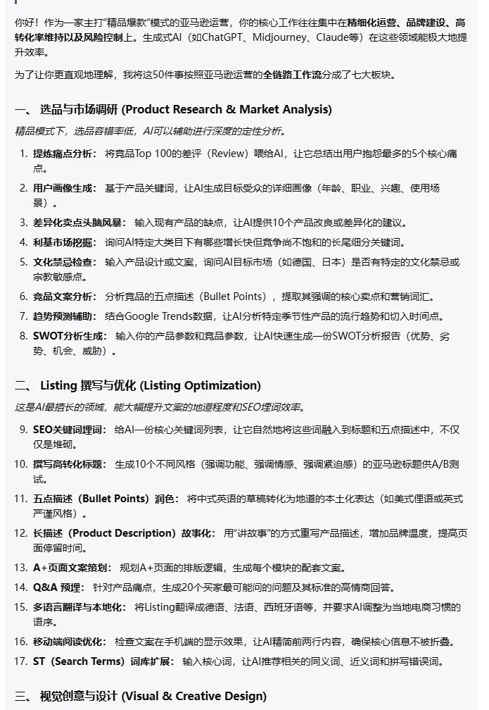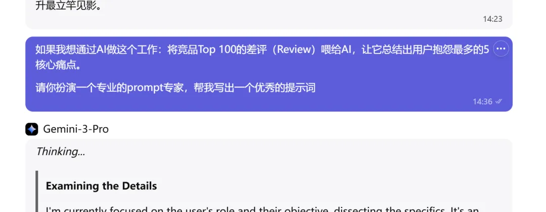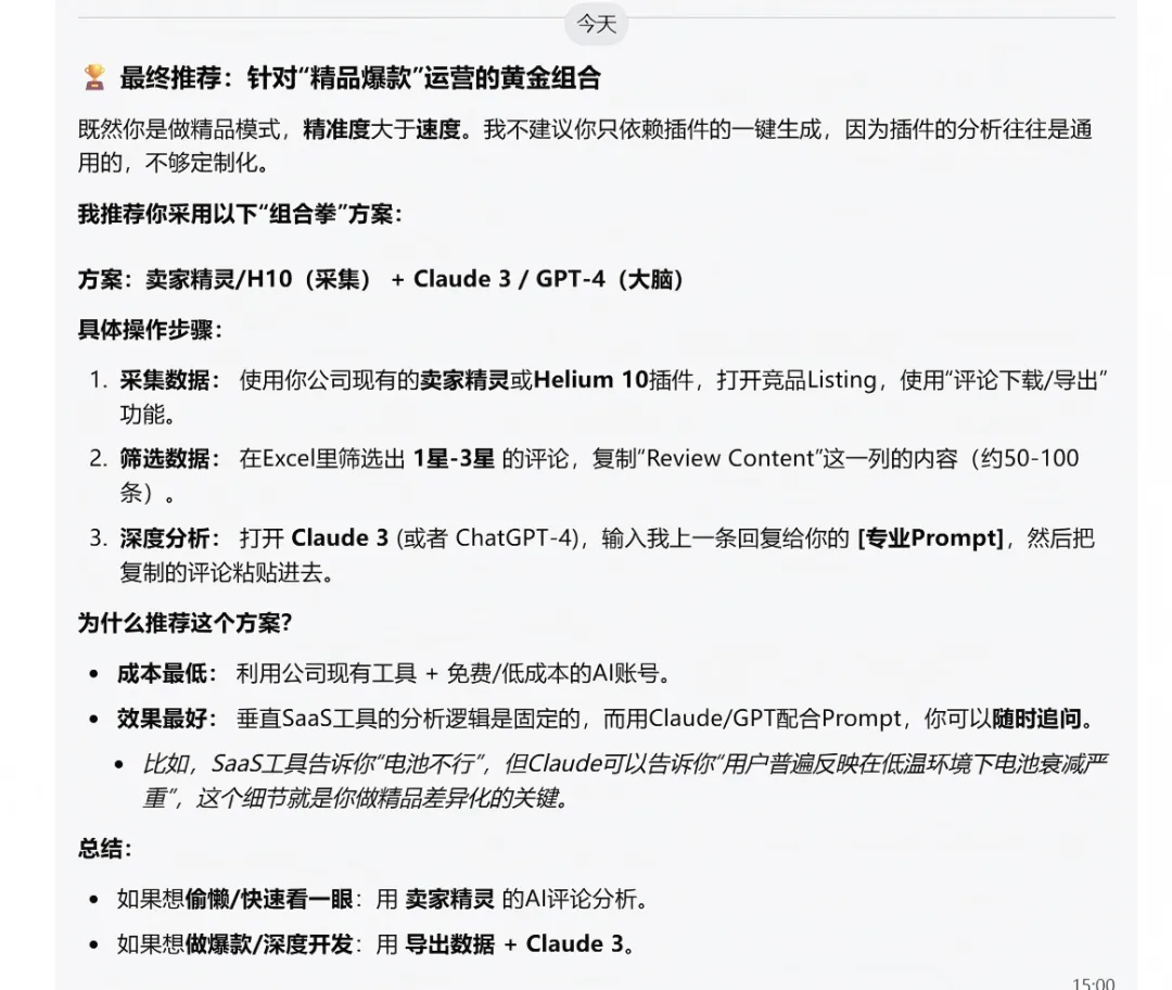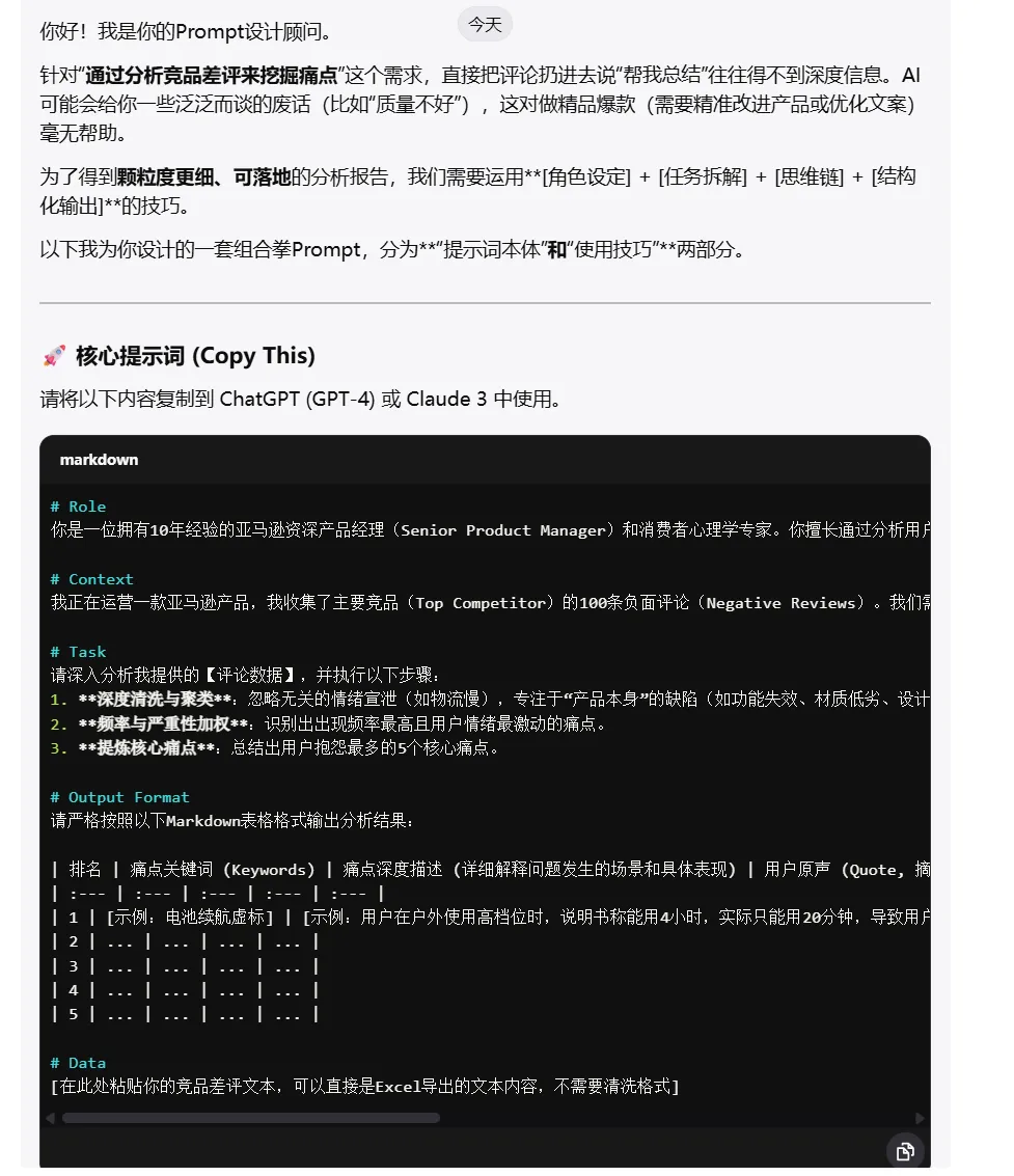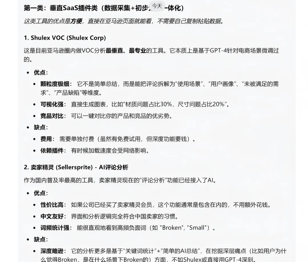 提炼痛点分析: 将竞品Top 100的差评(Review)喂给AI,让它总结出用户抱怨最多的5个核心痛点。