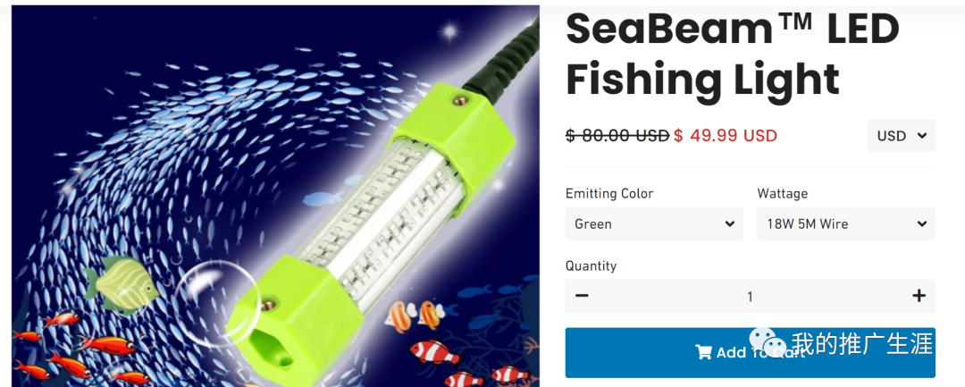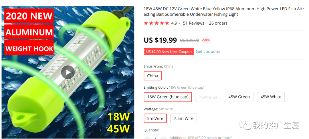 这是一款水下照明灯,钓鱼爱好者的工具,售价49.99美元,不管国内外都有数量庞大的钓鱼爱好者,这对于投放广告的时候比较容易定位精准的受众。