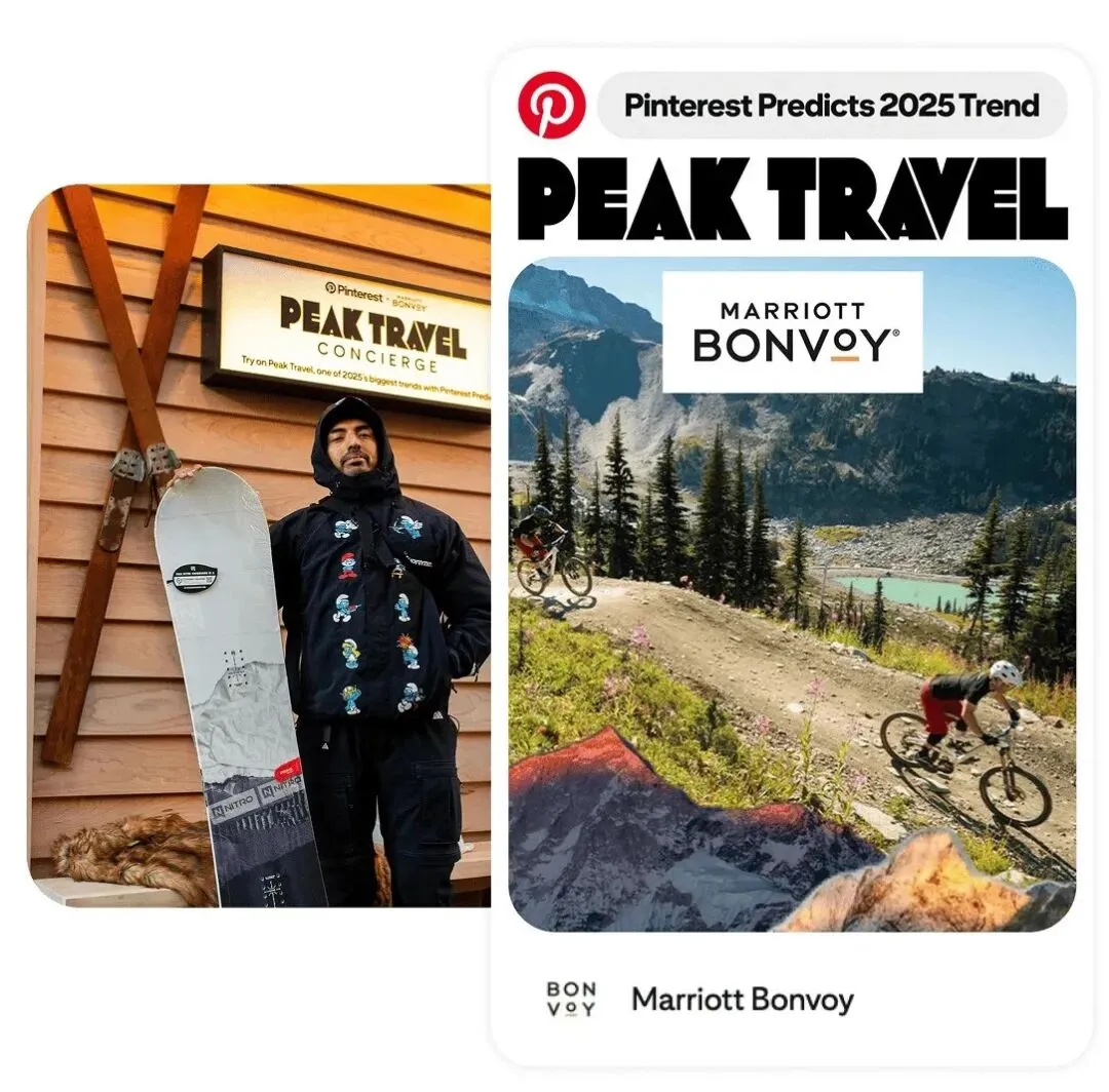 案例层面,Marriott Bonvoy 就曾将 Pinterest Predicts 2025 的趋势洞察直接转化为可执行的增长动作:当报告识别到 “Peak Travel(高峰旅行/山野旅行热)”成为快速增长的搜索趋势后,Marriott 围绕这一前瞻信号推出整合传播,在 Pinterest 端采用 Trend Badge、Premiere Spotlight 等资源,并配合 Trend Drop 抽奖互动与线下快闪体验,把趋势从“灵感”推进到“考虑与预订”。