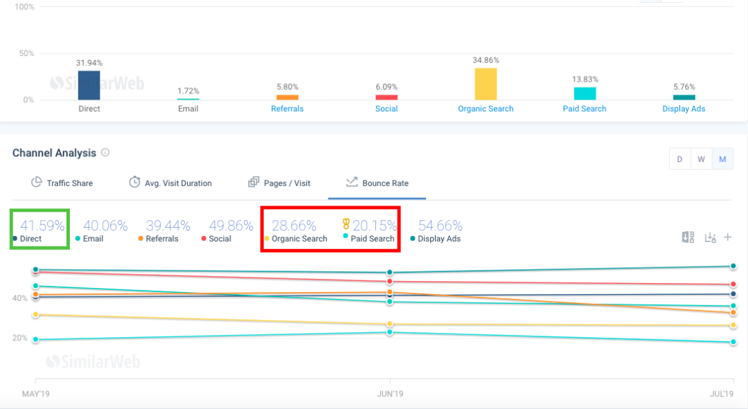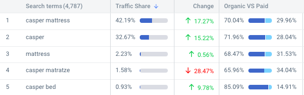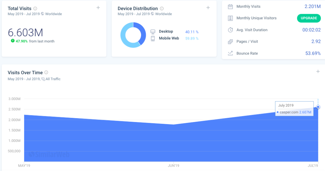 根据上图我们可以看到Casper网站浏览量最近一个月呈上升的势态,6月19日至7月19日一个月总浏览量达到260万。平均浏览时间为2分钟,每次访问页数接近3页,跳出率达到53.69%(略高了)。