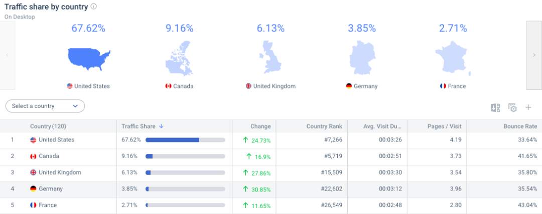 流量来源来自全球120个国家,最多来自美国占比67.62%,其次是加拿大、英国、德国、法国。流量质量上看,美国最优、英国和德国也不错,加拿大和法国流量略差一些。