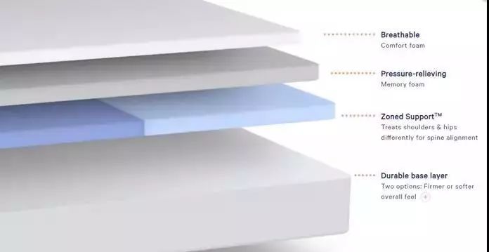Casper经过工程师团队无数次的调查研究,在结合用户满意度的情况下,选择了深受大众喜爱的材料,并于 2014年自主研发推出了第一款“The Casper“床垫——它能够提供良好的支撑性,又柔软不易变形。该款产品采用了四层海绵叠加的设计,其顶层为透气海棉层、第二层为记忆棉、第三层为过渡棉、第四层为支撑棉。这些设计及材料的使用,使得Casper床垫可以直接折叠压缩。