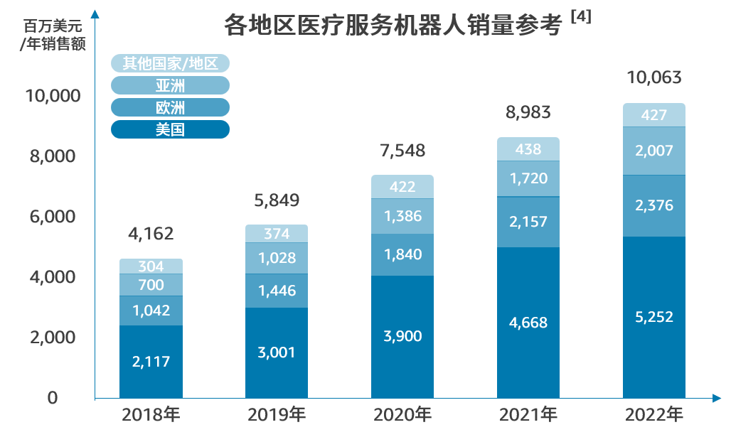 随着人口老龄化加剧、医护人员数量下降、医疗保健支持增加,以及相关技术创新推动,医疗服务机器人需求走高。当前,美国是最大的医疗机器人市场,该地区更大的医疗保健支出和更高的工人工资使自动化更具吸引力;亚太地区则因人口老龄化比重较大,预计将以最高的复合年增长率增长。