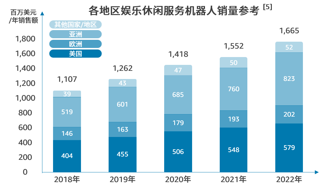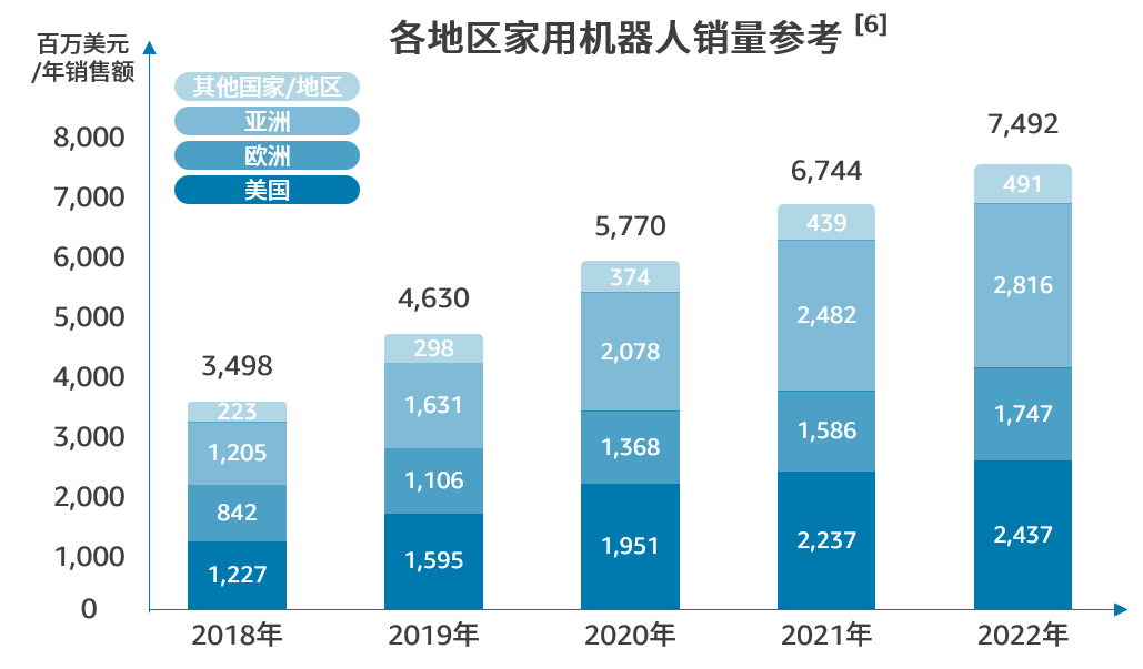 海外对机器人的需求不仅在B端场景,C端买家对机器人的热情也在持续上升。其中,以爱好为购买驱动的娱乐机器人就深受买家欢迎,例如有可编程机器人、宠物机器人等等。尽管当前整体销量并不高,但拥有一批忠实的追随者,前景广阔。从各地区的娱乐机器人年度销量数据可见,当前在美国和亚太市场销量领先,在欧洲的销量也稳中有升。