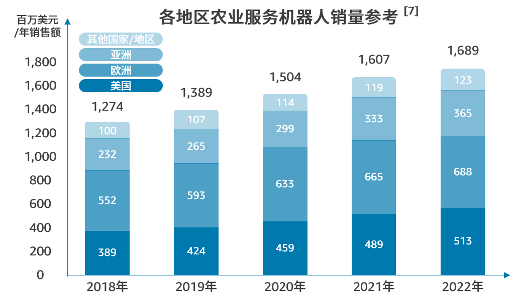 更自动化、精准化的农业机器人将帮助农民最大限度地提高产量,在2022年全球农业机器人销量增长至近17亿美元。其中,欧洲和北美是主要的市场参与者;而亚太地区则是因为较高的乳制品需求,进而推动自动挤奶系统和其他农业机器人的销量提升。