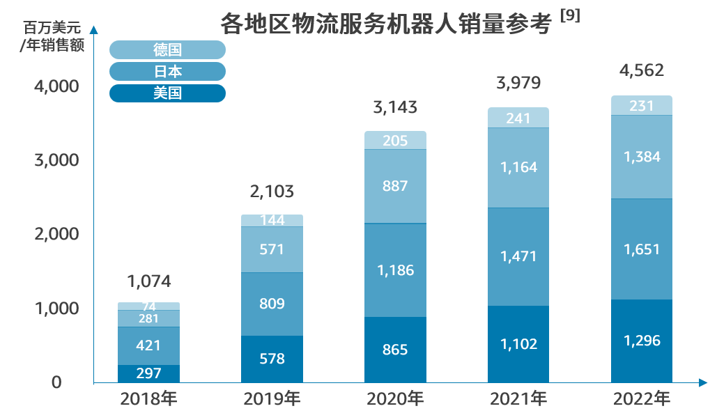 随着电商发展,智能仓储重要性持续加强,作为这一巨大市场的重要组成部分,智能物流机器人也迎来飞速的技术升级和迭代。在2018年至2022年间,亚太地区的物流服务机器人销量增长近11亿美元,而欧洲则是销量最高的地区,在2022年年销量高达16.51亿美元。