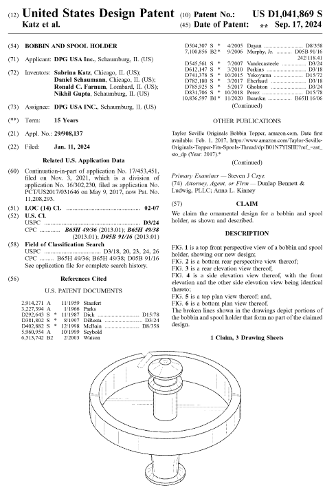 原告是一家美国公司,主要销售线轴梭芯顶这类缝纫产品周边。该公司的线轴梭芯顶适合所有流行的线轴尺寸,易于安装和拆卸,主要用于防止纱线在加工过程中的缠结、打结和损坏,确保生产过程中纱线的顺畅流动,是为缝纫爱好者创造的众多创新和高质量缝纫概念和用品之一。