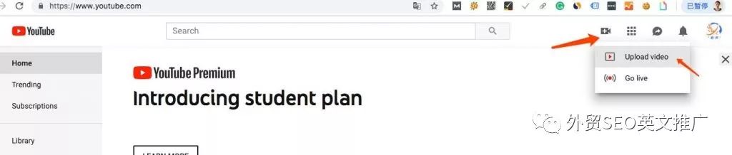 2、登录Youtube后,在右上方选择摄像头按钮,点击Upload video