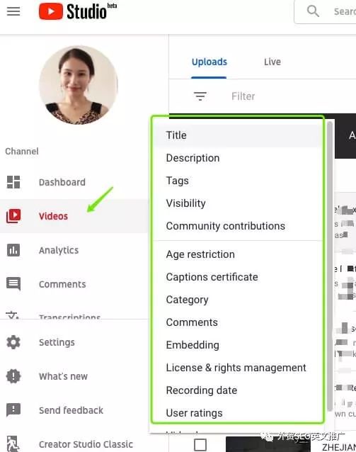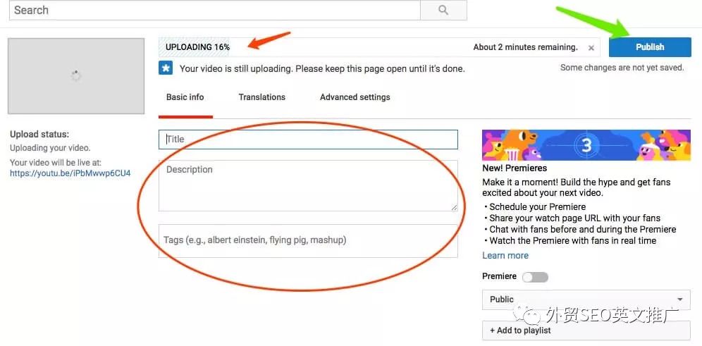 圆圈内是要对视频进行的基础信息描述,包括Title(最重要),Description和Tag。