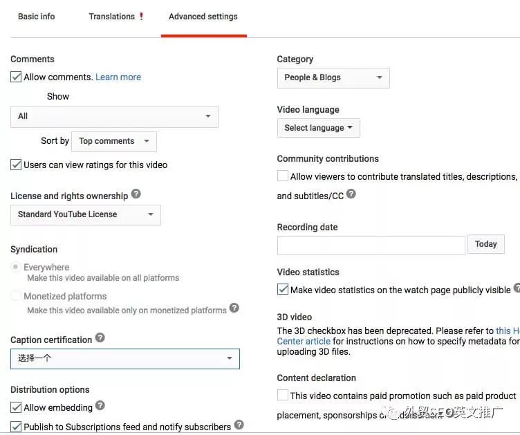 Advanced settings即视频的一些高级设置,比如允许评论,启用年龄限制功能(对于成人内容很是关键)等,如下图: