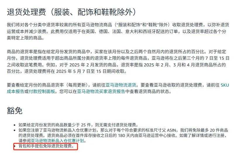 不过好消息是:从5月15日起,针对背包和手提包等退货率较高类商品,亚马逊将免除退货处理费。且2月1日起售出的背包和手提包,若产生退货处理费,系统会自动免除或退还,无需卖家额外操作。(适用站点:英国、德国、法国、意大利和西班牙)