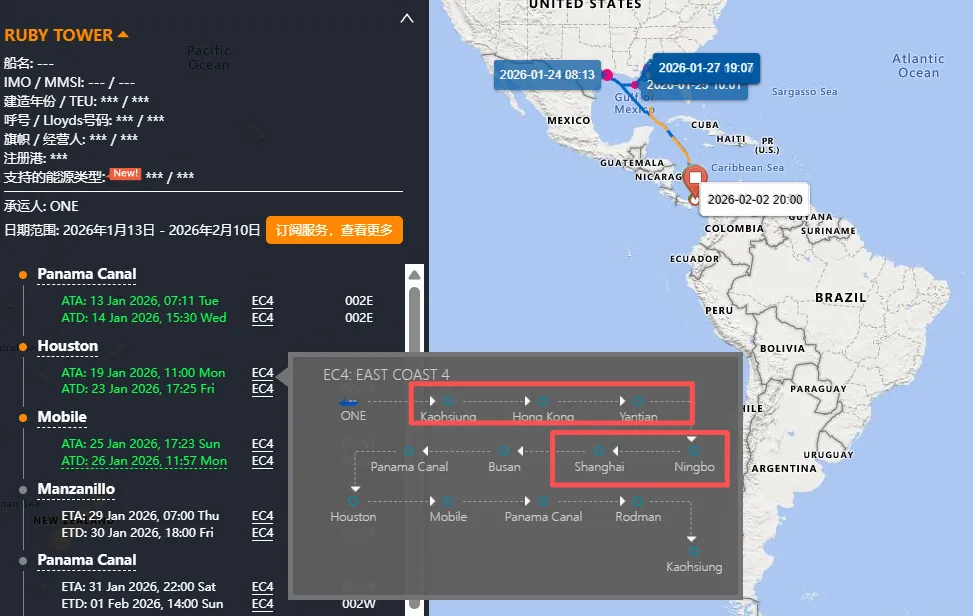 “RUBY TOWER”号建于2013年,船长300米,载箱量约为9000标准箱,在利比里亚注册。该轮服务于ONE的美国东海岸4号航线(EC4 - US East Coast 4),事发时正执行002W航次。其挂港港序为:盖梅港(Cai Mep)-盐田港(Yantian)-宁波港(Ningbo)-上海港(Shanghai)-釜山港(Pusan)-休斯顿港(Houston)-莫比尔港(Mobile)-罗德曼港(Rodman)-高雄(Kaohsiung)-盖梅港(Cai Mep),涉及HMM、YANG MING、EVERGREEN和ONE四家船公司共舱。
