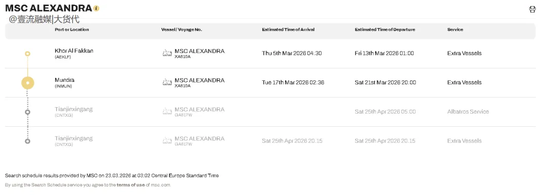 事故发生时,航次号为XA610A;从船期表看,该船应是MSC临时增派(Extra Vessels)。
