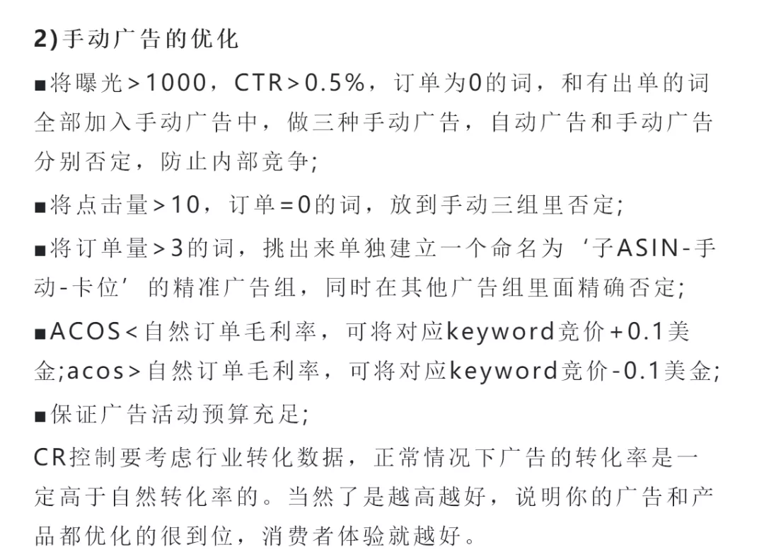 ■将曝光>1000,CTR>0.5%,订单为0的词,和有出单的词全部加入手动广告中,做三种手动广告,自动广告和手动广告分别否定,防止内部竞争。