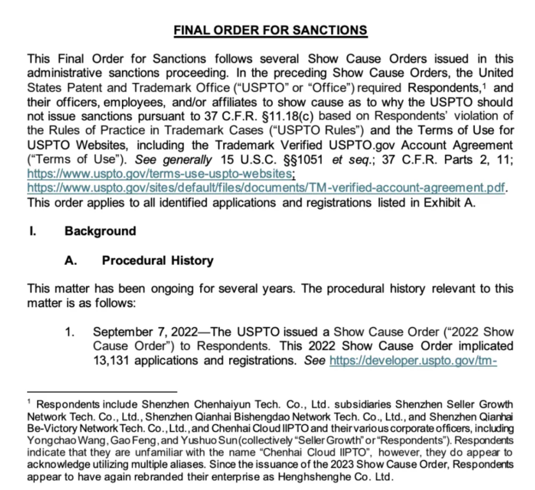 美国专利商标局对一家外国申请公司(中国深圳SG及其关联公司)实施制裁,终止 52,000 余件与该公司相关联的涉嫌欺诈取得或维持的商标申请及注册。