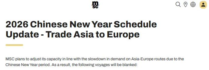同时,MSC发布通知,鉴于春节期间亚欧航线需求放缓,MSC计划调整运力,以下航次将被取消: