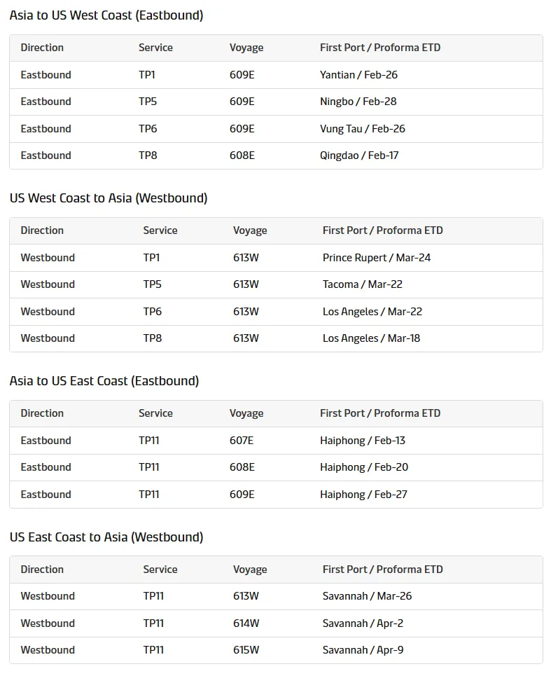 2026年中国新年——跨太平洋航线航次调整