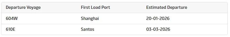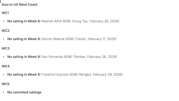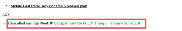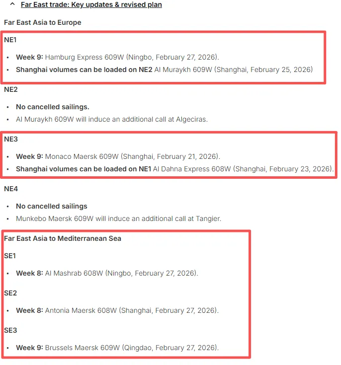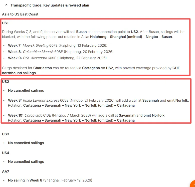 对于美国东海岸,受影响的是US1航线,该航线将在2026年第7、8和9周停靠釜山后结束;以及US2航线,该航线将在第8周停靠萨凡纳并在第10周跳港诺福克。对于西海岸,WC1、WC3和WC4将在第9周停航,而WC2将在第8周停航。亚洲-欧洲航线的停航包括第9周的NE1和NE3,以及第8周将停航的SE1和SE2,SE3则在第9周停航。