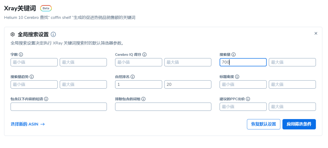 点击“全局搜索设置”,设置搜索量至少700,并且自然排名在前20。