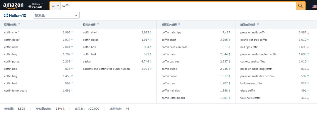 当用户安装过插件后,打开亚马逊首页的搜索框,只需要输入一个关键词比如“coffin”,插件就会展示亚马逊建议、相关关键词以及众多长尾词。