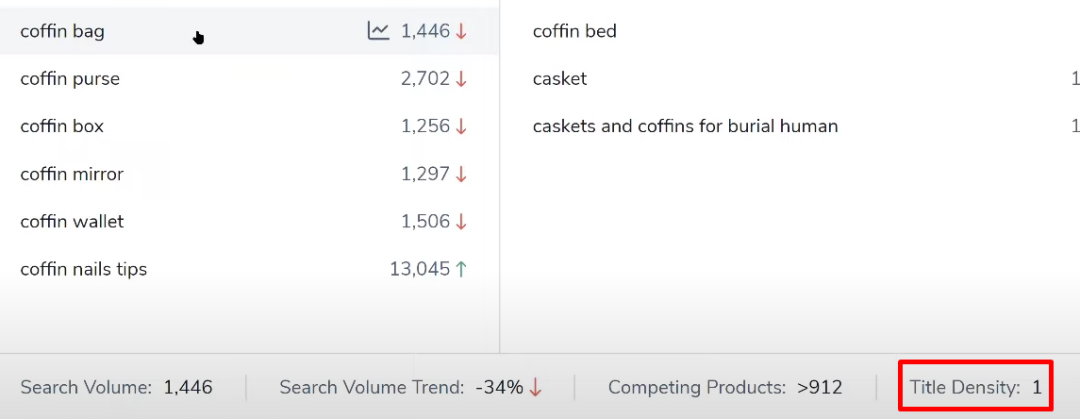例如“coffin bag”这个词,每月搜索在1500次,但标题密度仅为1,这表示,整个亚马逊首页上只有一个listing的标题上具有该关键词,竞争指数非常小。