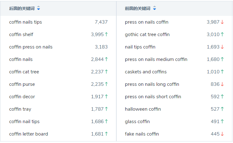 最后,由此衍生的一系列长尾关键词,比如coffin nails tips、gothic cat tree coffin等,这些词来自关键词工具Magnet,可以作为拓词选择。