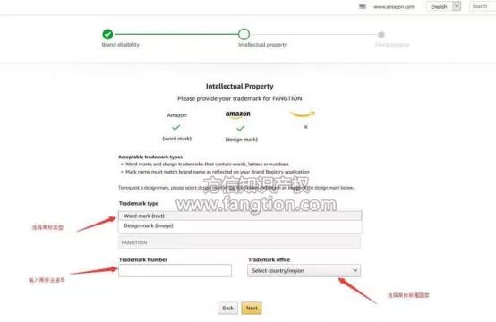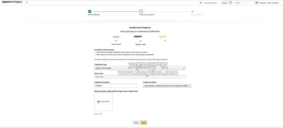 到这一步的时候,需要特别注意的就是商标类型的选择。亚马逊备案只有两种类型:word mark,design mark,也就是文字商标和设计商标,下面的商标名是自动弹出来的,因为我们在上一步已经填写了,再往下trademark number就是输入我们的商标注册号,然后旁边的这一栏trademark office就是选择我们所注册的国家或地区,填完信息后点next就是进入到下一步。