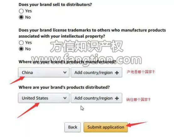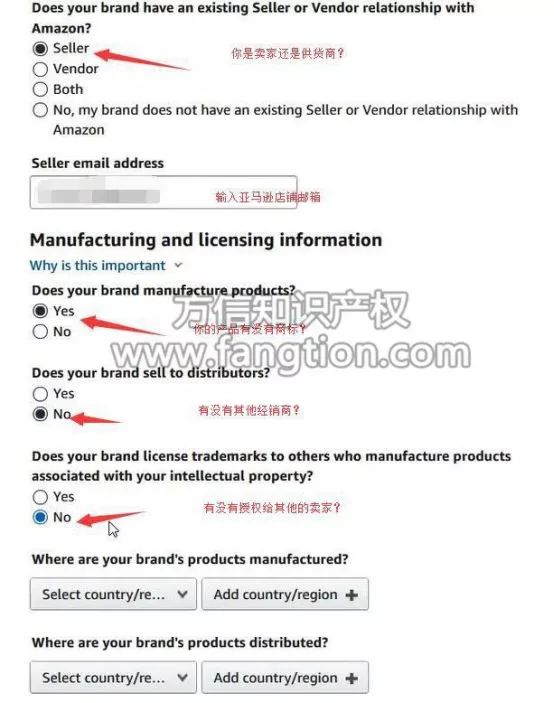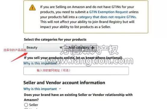 我们往下拉之后,首先是要选择备案的品类,比如你是做美妆的还是卖珠宝的,选完品类后下面有个框可以填品牌官网,这个不是必填项,但填了的好处就是你有一个品牌域名在里面。再往下拉是卖家信息的完善,一般第一个问题我们都是选择卖家身份,下面店铺邮箱,假如你最开始就是用品牌域名的,这个邮箱是最好的,因为后面亚马逊会有相应的VC账号的邀请还有很多内容都会发到你的邮箱里面去的。接下来几个问题都是根据自己实际情况去填写的,一般来说,一般的卖家都可以默认第一个问题选yes,第二个选no。第三个选no,再下面的是你的产品在哪儿生产的,要销往哪里,这些都根据你品牌备案的实际情况填写,然后提交,我们备案的步骤就完成了。