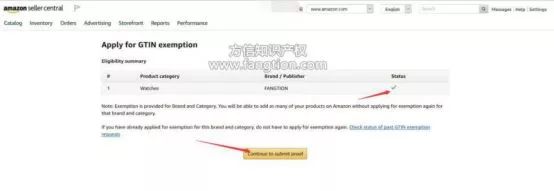 进入到界面,第一步是要选择品类,然后选择商标名,再点下一步,会看到我们选的品类和商标名,并且有一个检测的状态,它会打勾,就证明可以申请豁免,然后再点continue,输入相应的一些证明文书。