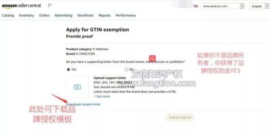 接着会弹出一个问题:你是品牌的所有者还是授权方?授权方回答yes,然后输入我们的授权书。如果你不知道授权书怎么写的话,亚马逊提供了模板,我们可以把模板下载下来填写好后上传就OK啦;品牌的所有者选择no,然后进行相应的豁免申请。
