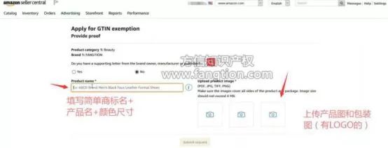 选择了no,会弹出product name,这里直接按照listing的标题格式来填写,用商标名加上产品名加上一些简单的产品属性,再在右边的图片这里上传相应的产品图和包装图,要注意,产品图和包装图都要带上产品的logo,而且至少要上传两张图片。到此,就完成了UPC豁免。