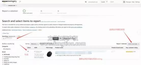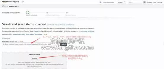 进入链接后,我们会看到进行品牌备案后的投诉页面非常的智能,允许我们来进行搜索,而且还提供了两种不同的搜索方式。第一种的话就是直接输入品牌名和产品名进行一个匹配搜索。另外也可以直接输入asin来匹配。