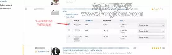 在输入关键词或者asin后,会出现相应的跟卖我们的listing。我们只要在跟卖前面的这个小框框前点勾,我们就可以投诉它,假如你选择这个listing的第一个框框,那么不管是你还是跟卖的人都不能再卖了,整个listing都会被下架掉。
