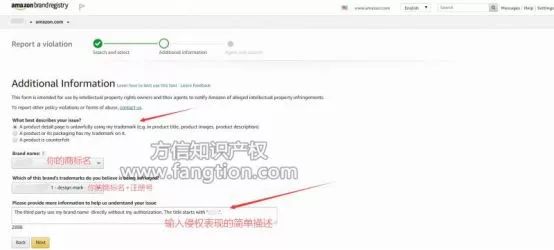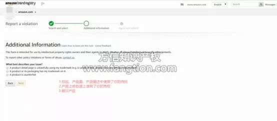 假如我们选择的是商标侵权,之后就会进入到下一步去完善其他的一些信息,daoadditional information里面,他也会问我们对方侵权的表现,这里有三个表现:第一个是对方是在标题上面或是产品图或是描述里用了我们的商标;第二个是产品或是包装上用了我们的商标;第三个是假冒的产品。选择二和三需要提供相应的证据,这种投诉会比较有利。