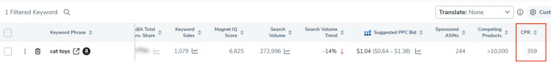 假设关键词是cat toys,H10 中显示 CPR = 359。