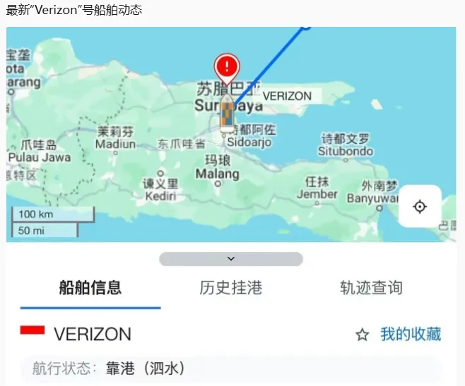 据船舶定位查询显示,“Verizon”号集装箱悬挂印度尼西亚国旗,建造于1995年,载重吨为15400吨,船长145.68米、船宽25米,目前依然停靠在泗水丹戎佩拉港。