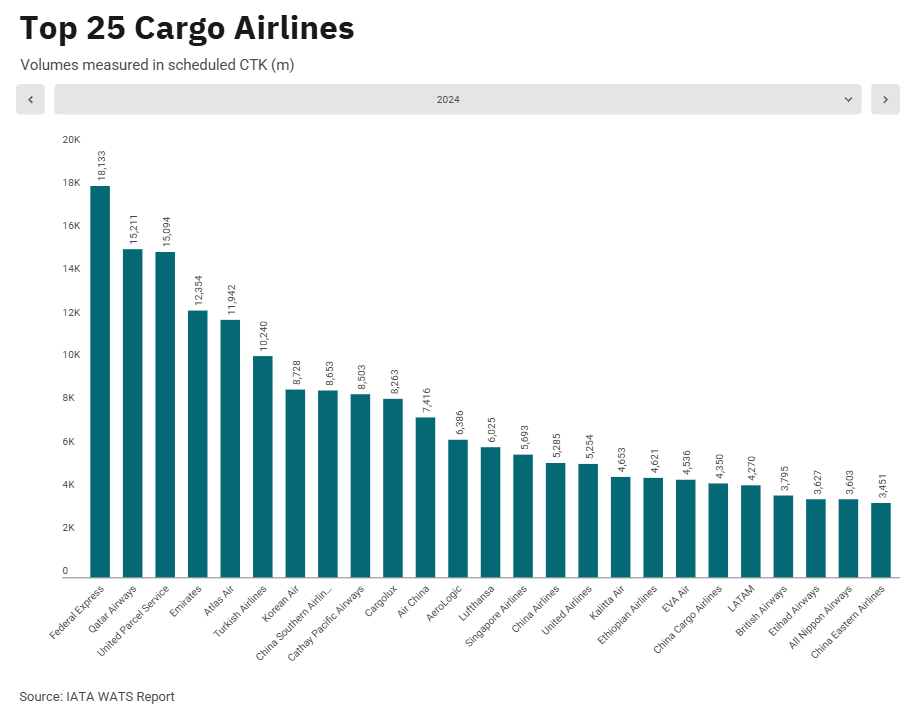 受红海冲突导致的海运中断和电商繁荣的推动,全球航空货运需求增长超过运力,货运量显著上升。根据国际航空运输协会(IATA)的《世界航空运输统计》(WATS)最新报告数据,2024年全球前25大航空公司的货运需求(以货运吨公里CTK 计)同比增长9.4%。