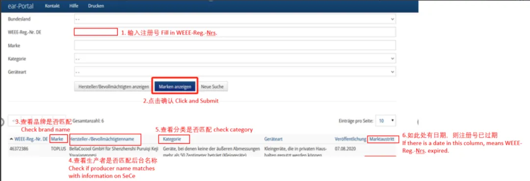 Step3:在页面下方弹出的信息里,查看“Marke”列对应的品牌名称是否跟您合规门户中要求的品牌一致。