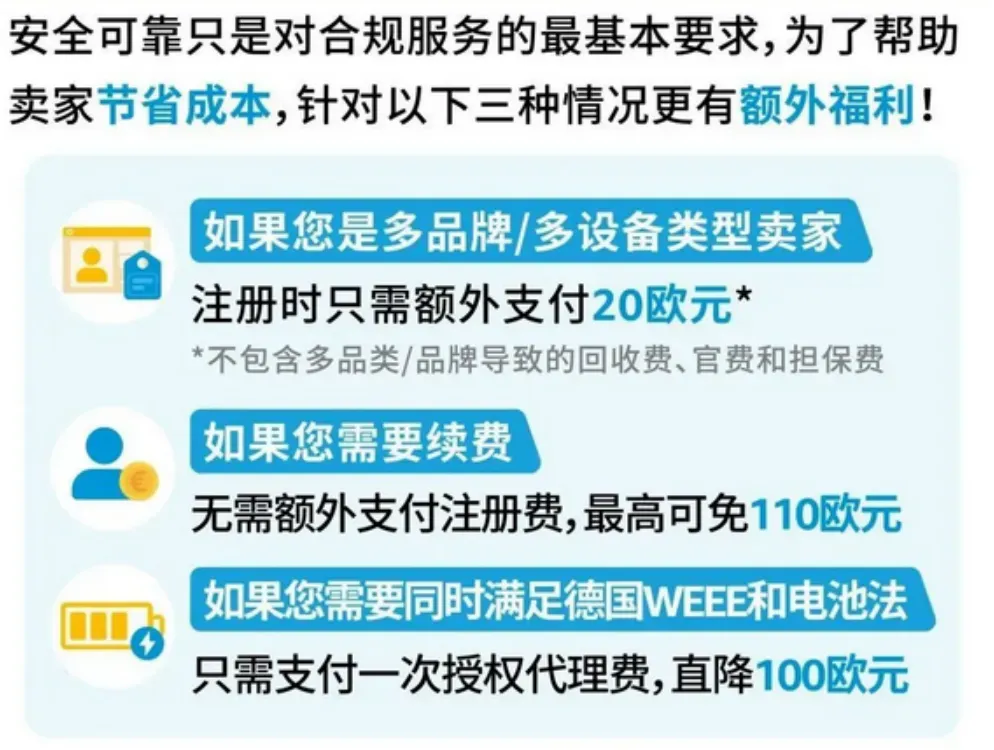 🔸 省时省心:最快一周拿到EPR注册号,助您抢跑欧洲市场!支持注册或添加法国、德国、西班牙、奥地利的多个分类,一站式解决欧洲多国EPR合规问题。