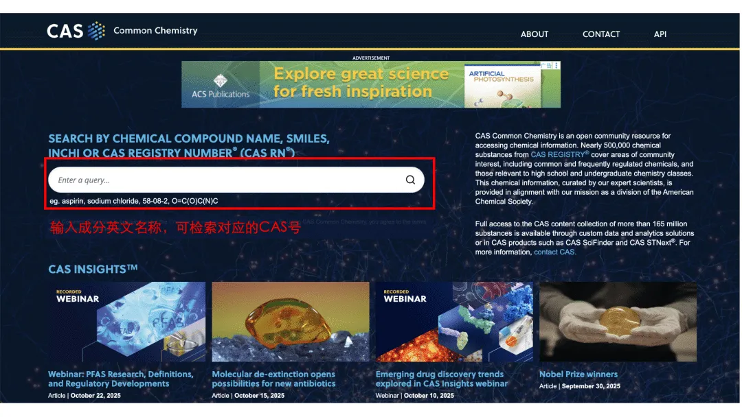 进入Commonchemistry网站(参考网址:https://commonchemistry.cas.org/),输入成分英文名称查询: