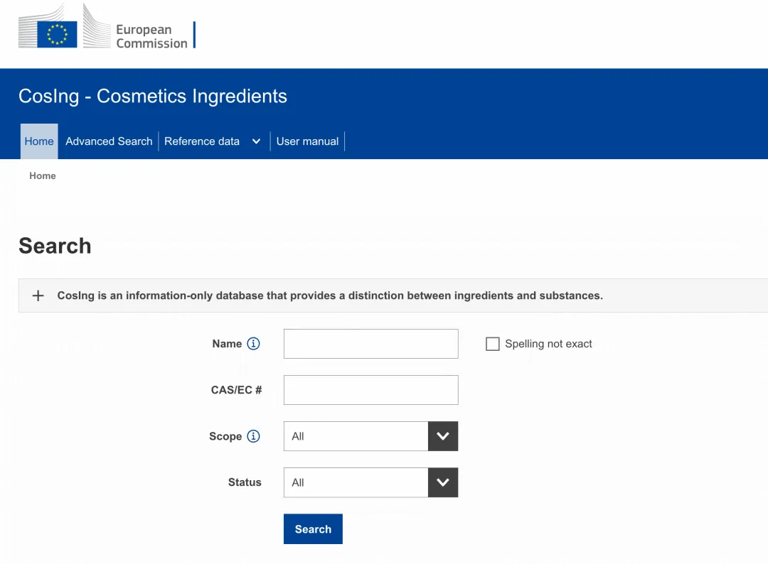 Search(常规搜索):可通过成分名称(如INCI名、化学名、CAS号等)进行搜索,适用于日常查询。