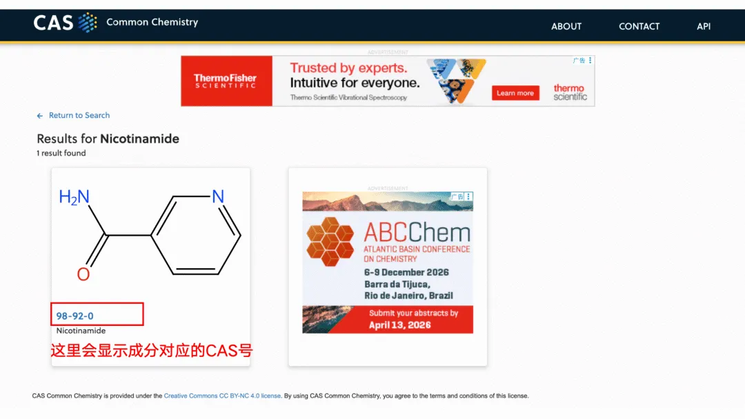 第一步:在https://commonchemistry.cas.org/ 搜索框输入:Nicotinamide,按下“回车”键。