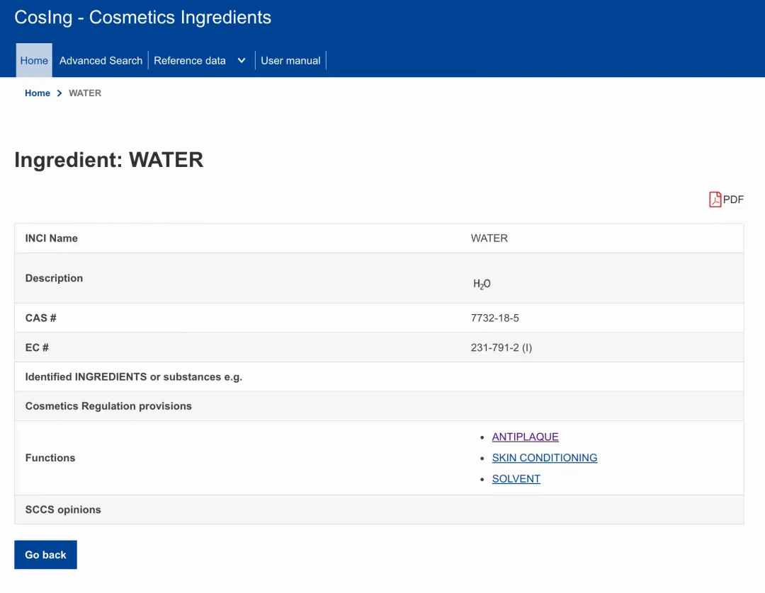 在CosIng数据库中,其INCI名称可以是“WATER”或“AQUA”。