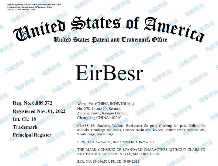 本案为国人原告,截止发帖前已发案近8起,案件涉及商标已曝光如下!EirBesr 商标注册在第 18 类:书包;钱包;宠物背包;宠物服装;动物项圈;女士手提包;皮革信用卡夹;皮革信用卡钱包;运动包;旅行包。