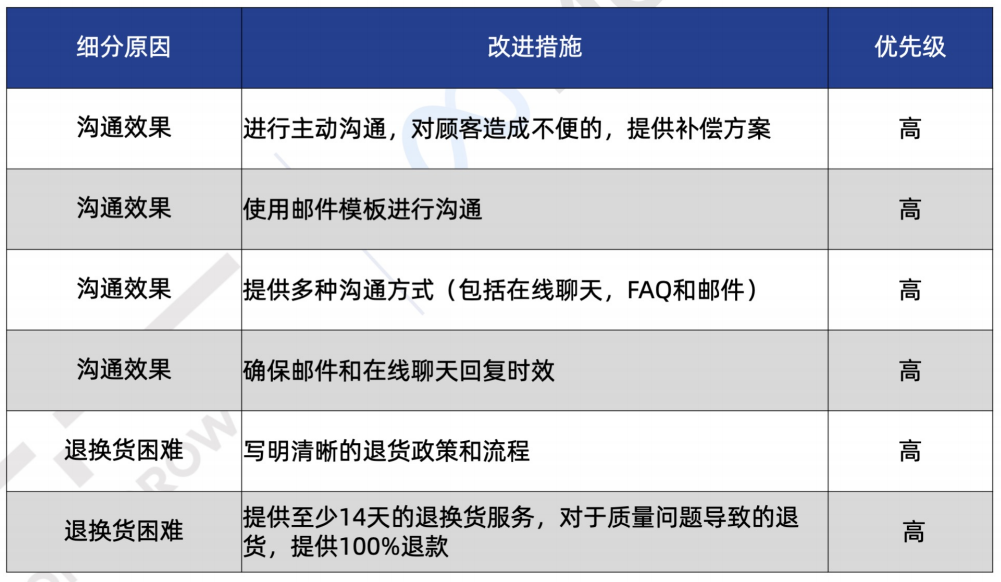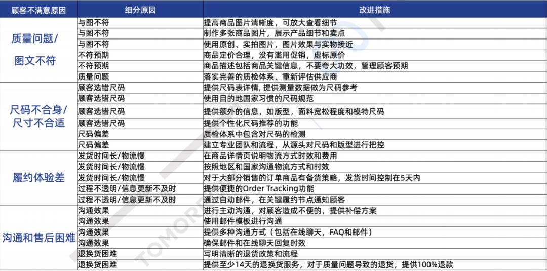 “改进措施表一”:顾客不满意的原因对应的改进措施