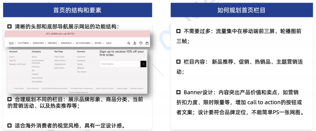 (1)打造有吸引力和架构的清晰首页,传递品牌故事,首页栏目应当包括当前热销品类、快速分类、特定主题collection;