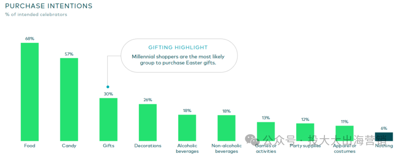 有30%的消费者计划在复活节送礼物。报告中特别标注“千禧一代购物者是最有可能购买复活节礼物的群体“,而他们正是最依赖社交媒体的年龄群体,因此年轻化的营销颇为重要。