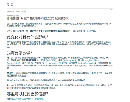 此外,欧盟新电池法规将于 2025 年 8 月 18 日前生效。卖家需要在截止日期前向亚马逊提供欧盟电池法 EPR 注册号,这一法令涉及除意大利之外的其他欧盟国家,包括德国、法国、西班牙、波兰、奥地利、瑞典等。